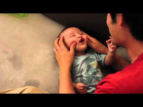 1. Awww! I love his lil' laugh! That is so funny that he laughs when you massage his face, which is getting so round and chubby, btw! So cute =) He looks just like you tho haha